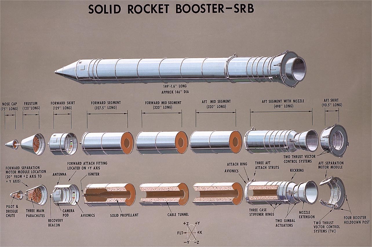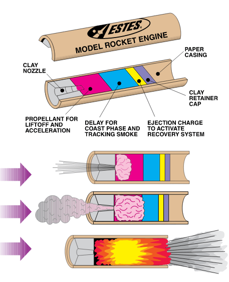Compare the SRB diagram to a small model rocket motor diagram. Note how they both have a heat resistant nozzle, & the ignition happening within a chamber (at the top of the SRB and at the bottom for the model rocket).