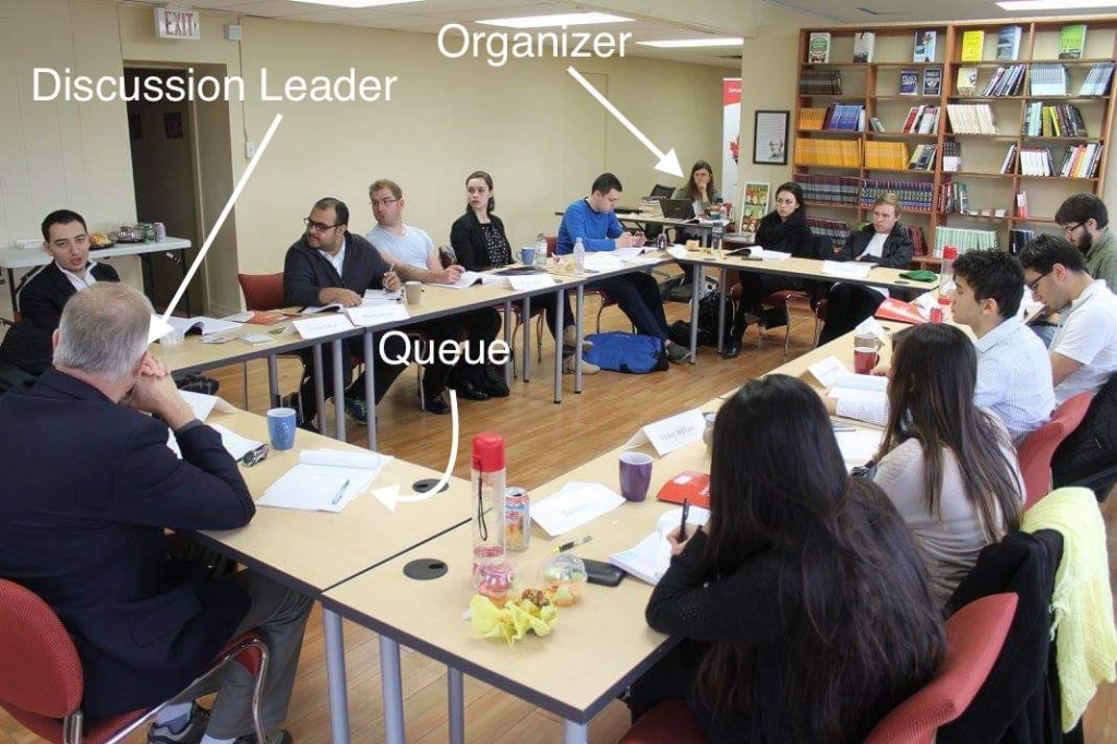 Here is a typical set up for such a discussion. This photo is from the Institute for Liberal Studies’ Facebook page. (The ILS calls these discussions “Socratic seminars.”) In this photo, you can see the rectangular seating arrangement, the name tags, the Organizer (Janet Bufton) sitting in the back, the Discussion Leader (Professor Glenn Fox), and you can also see the queue in front of him.