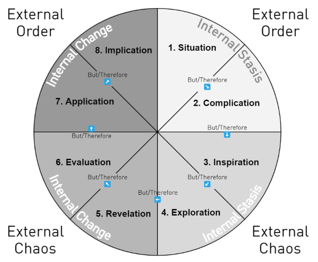 In the story circle diagram above, you’ll notice that the circle is broken up in half both vertically and horizontally. The vertical division splits the circle into left and right: the right side (stages 1-4) is labeled “Stasis”, while the left side is (stages 5-8) is labeled “Change”. The circle is also split into an “Order” half (stages 1, 2, 7, and 8) and a “Chaos” half (the middle 4 stages).
